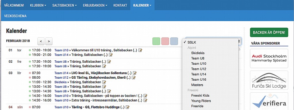 KalenderVälj att se allt eller filtrera på en träningsgrupp eller arbetsgrupp med menyn till höger.
