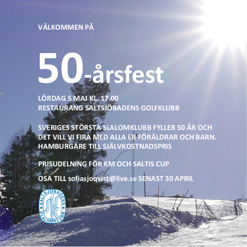 Saltsjöbadens slalomklubb fyller 50 år och det vi vill vi fira med alla föräldrar och barn. Lördagen den 5 maj börjar med städdag i backen. Vi fortsätter kvällen kl 17.00 på Saltsjöbadens Golfklubbs restaurang med prisutdelning för KM och Saltis Cup samt efterföljande Fest!