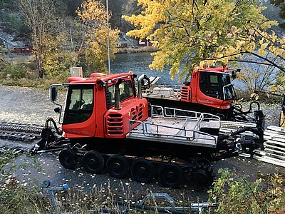 Idag tog vi leverans av vår "nya" pistmaskin, Tracy. Tracy ersätter Sanne som gjort 5 säsonger i klubben. Bägge är av modellen Pisten Bully 300 Park från 2005 men Tracy har bara 7600 driftstimmar medan Sanne har 12900h. Lägre driftstimmar bör ge högre driftssäkerhet, ngt vi strävar efter för vår korta säsong. Precis som när man köper en begagnad bil så vet man inte helt säkert, men vi har gjort alla tänkbara kontroller och besiktningar. Tracy är lite som en Mercedes från 2005, med 25 000 mil på mätaren - hon kan gå felfritt i 25 000 mil till, eller så börjar hon bråka. Låt oss hoppas på det första...